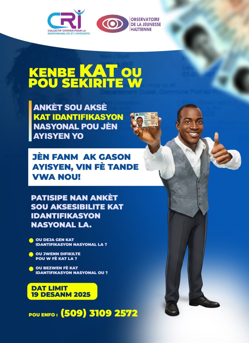 Le Collectif Citoyen pour la Responsabilité et l’Intégrité (CRI) et l’Observatoire de la Jeunesse Haïtienne (OJH) informent le public en général, et la jeunesse haïtienne en particulier, du lancement officiel d’une enquête nationale sur l’accès des jeunes à la Carte d’Identification Nationale (CIN).